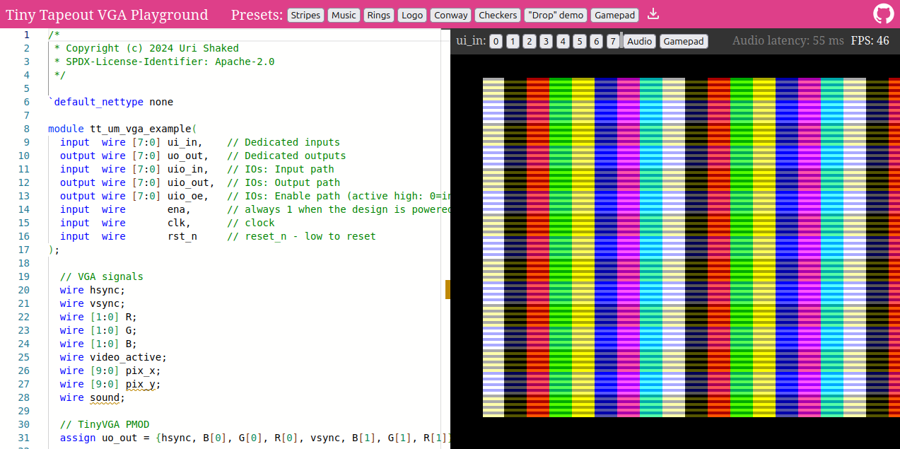 After you’ve familiarised yourself with VGA Playground, pick one of the following presets to base your design on: “Stripes”, “Rings”, “Logo” or “Checkers”.