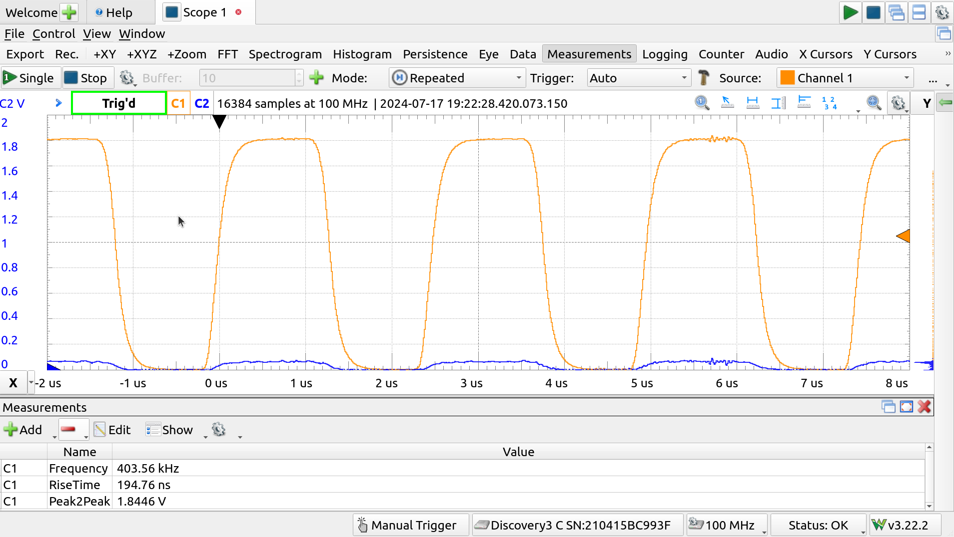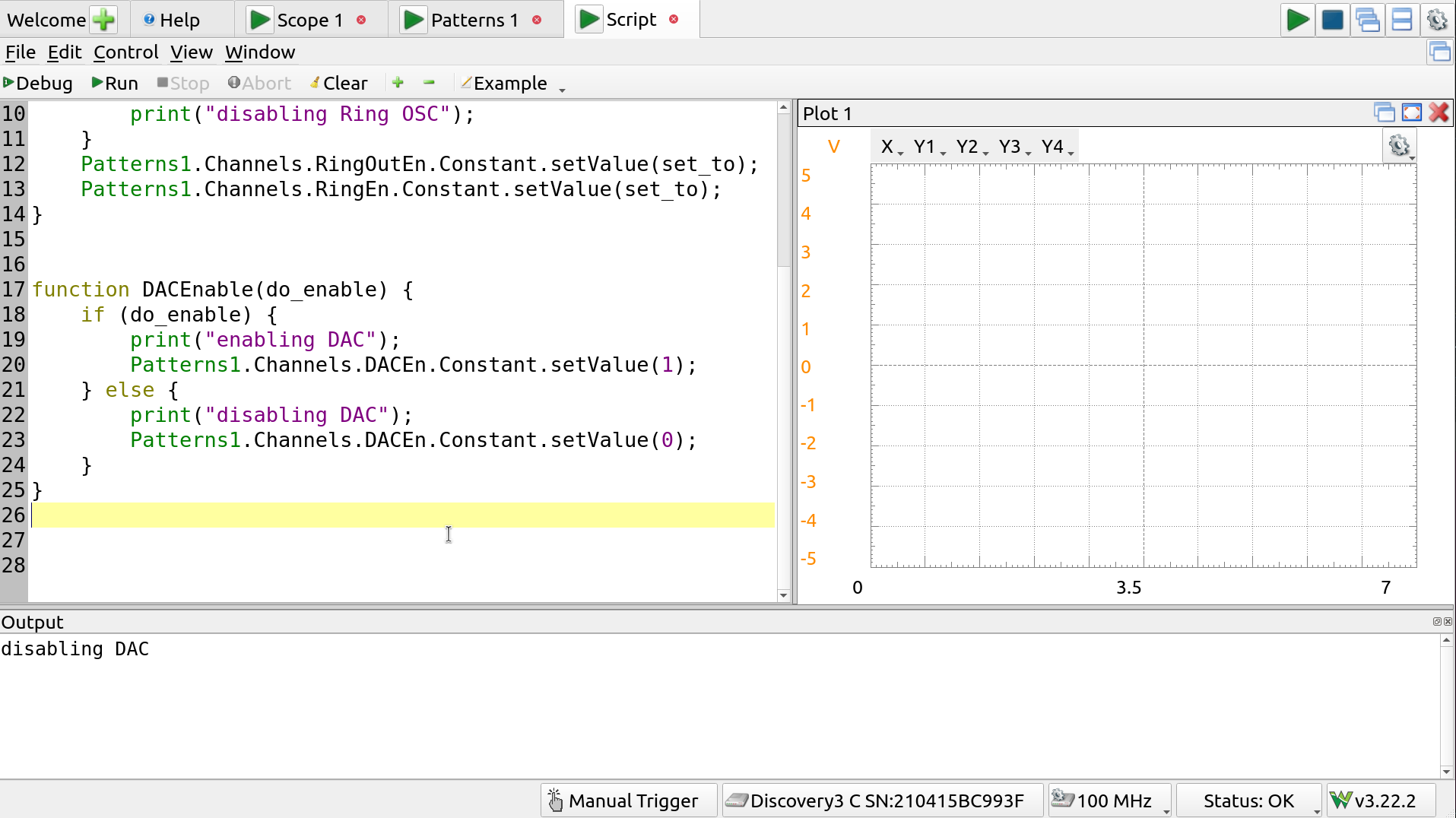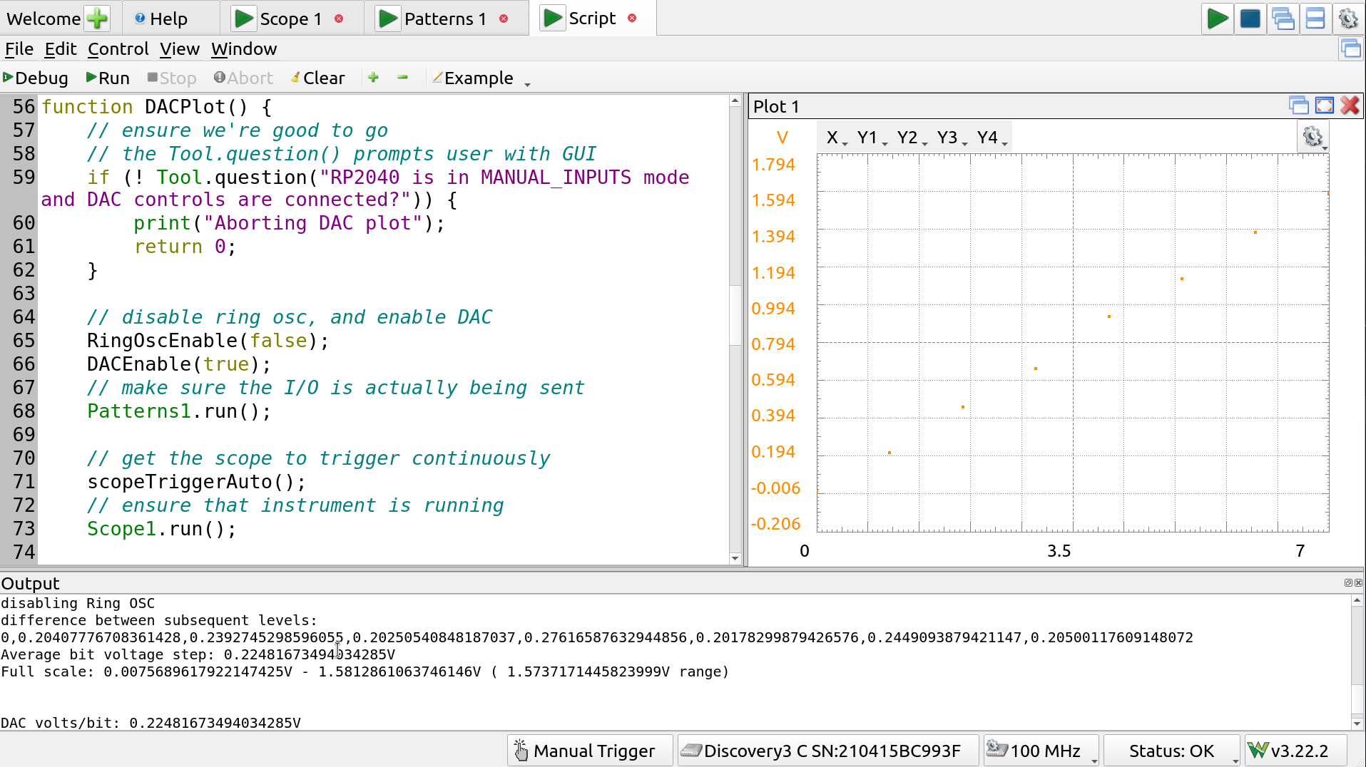 Doing everything manually–managing the device from the REPL on one hand and the instrument in another piece of software–works fine but for automating tasks and reproducible results, we can give control to the AD3, using the digital I/O.