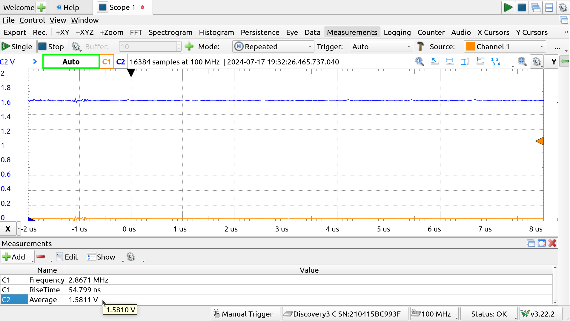 Using another measurement, a Vertical -> Average on channel 2, it looks like the DAC can only make it up to just under 1.6V.