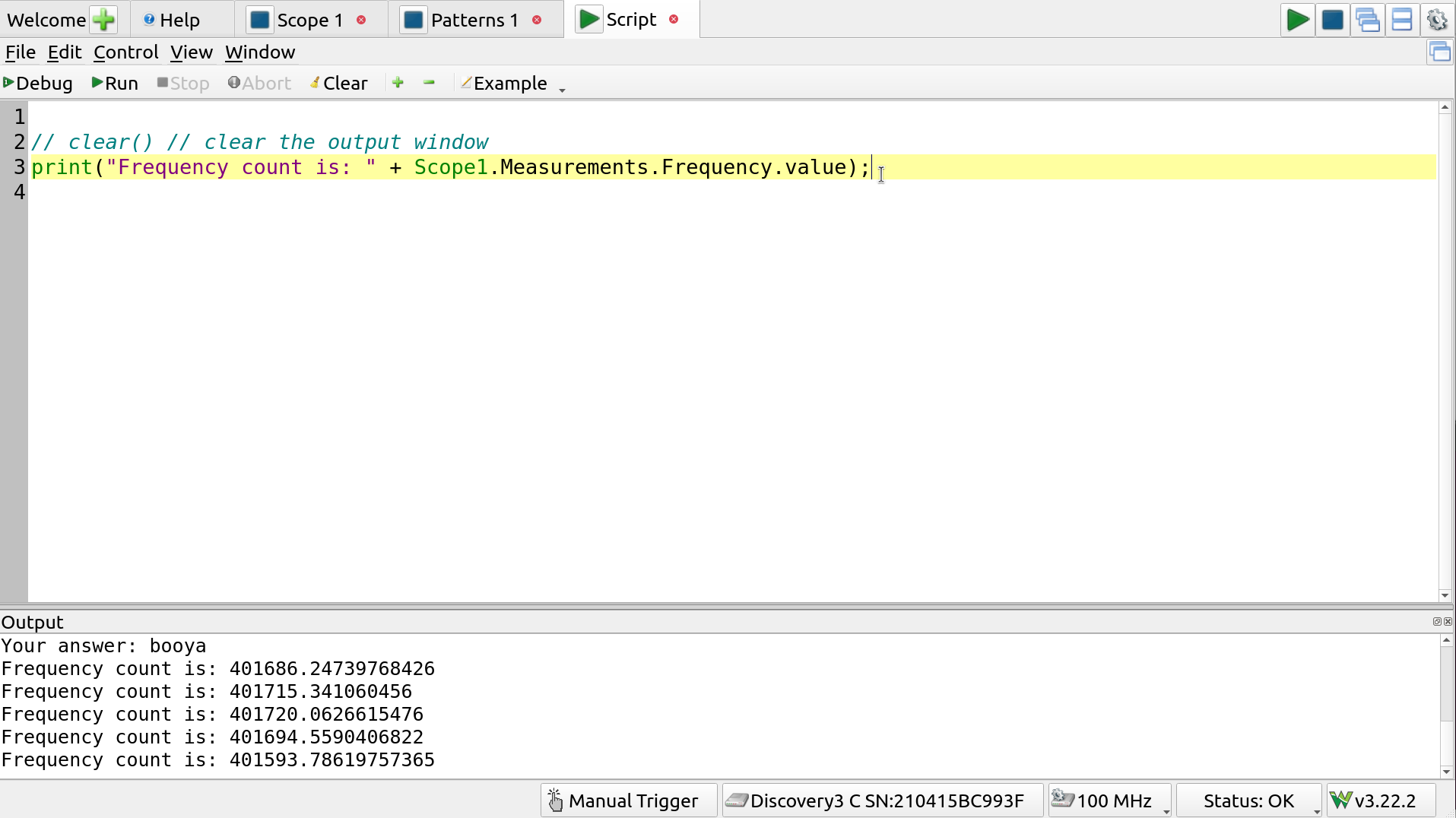 Here’s an example of printing out the frequency measurement reading from the scope, after having run it multiple times the output looks like: