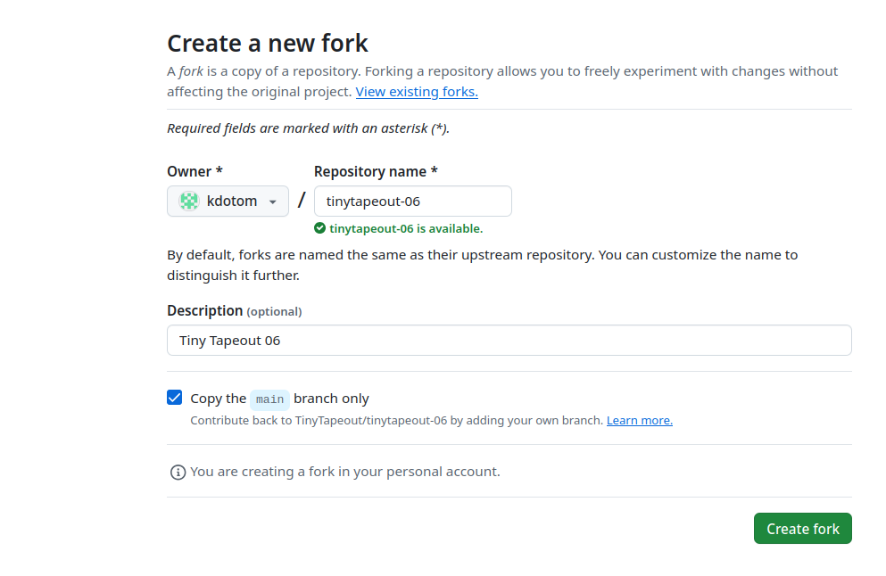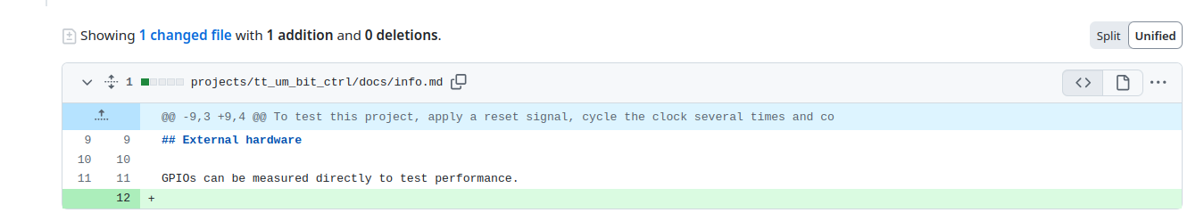 Note: only changes to the project’s documentation (including title, author, pinout, etc.) will be accepted. We will not accept changes to the sources, top level module name, number of tiles / analog pins, etc.