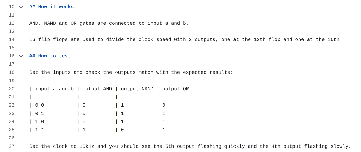 We put all the project information into the datasheet and the design’s public page on the website. You can use Markdown to write your documentation, telling everyone what your chip does and how to test it.