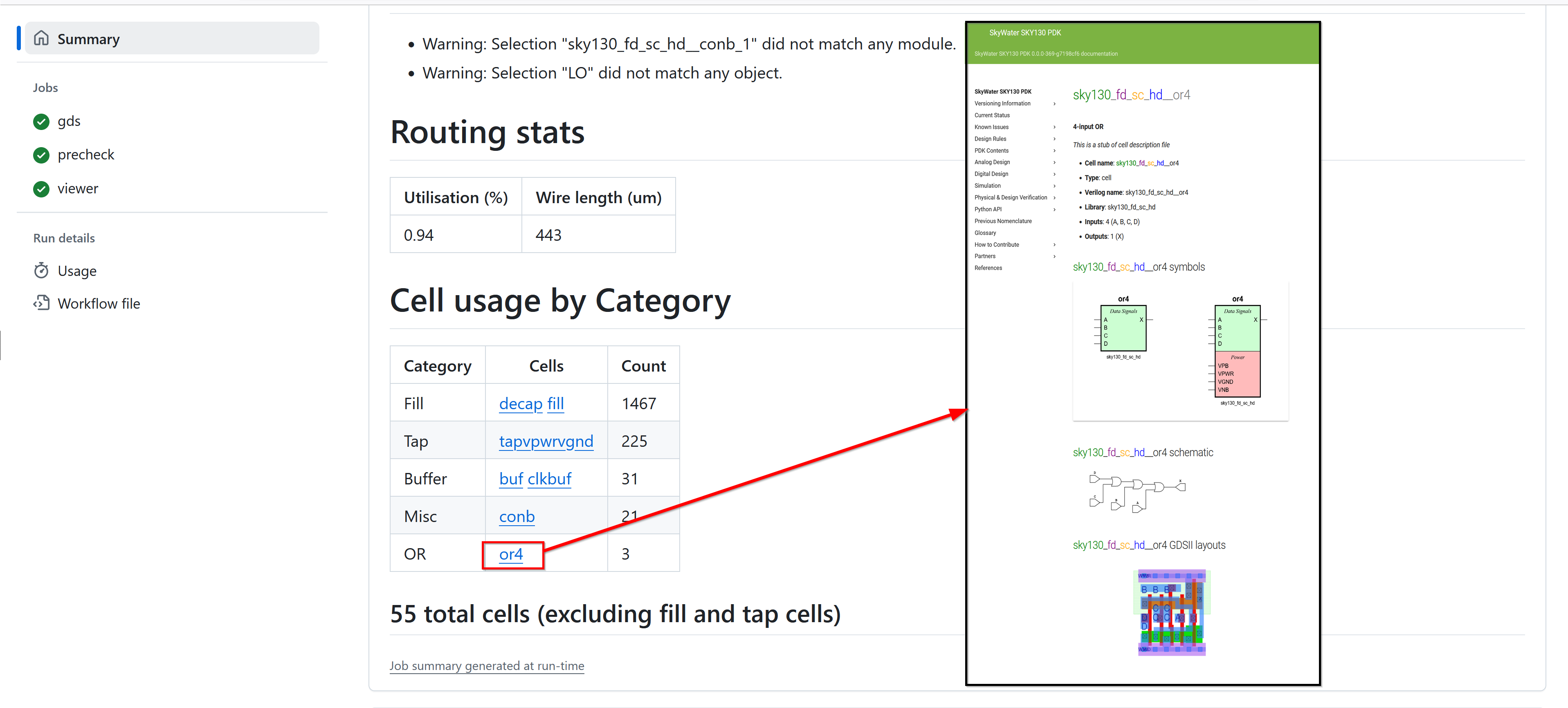 Take a look at the standard cell usage summary. These cells are part of the PDK from Skywater Technologies. The details for each of the standard cells can be viewed by clicking the links.