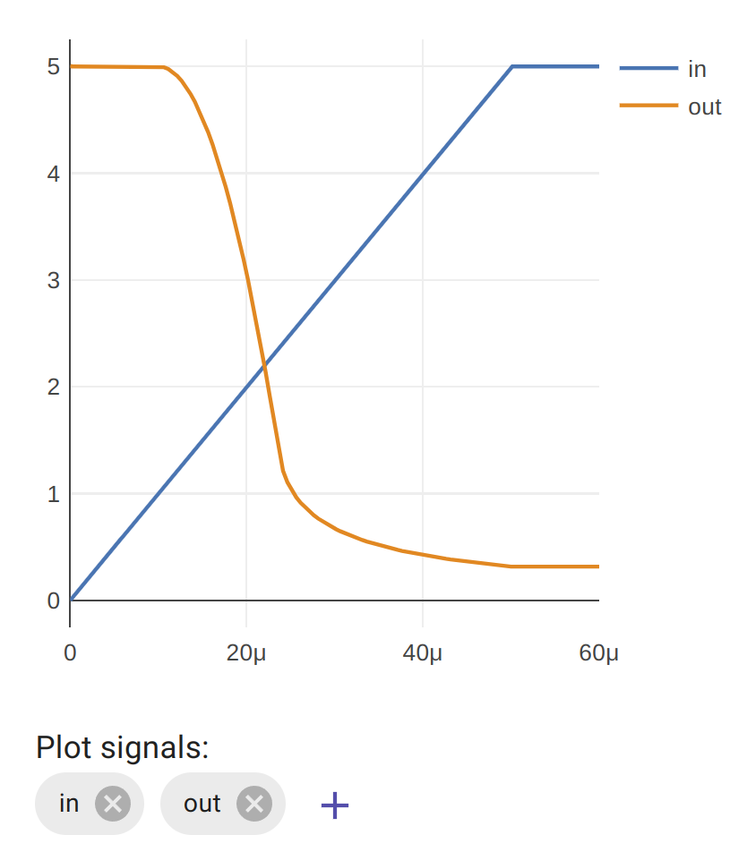 Once it’s wired up correctly, select the simulation tab and you should see a simulation result like this. You’ll need the in and out plot traces.
