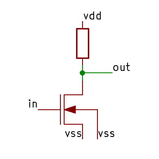 We can build a logic inverter with an N type MOSFET and a pull up resistor. This type of inverter is called an NMOS inverter.